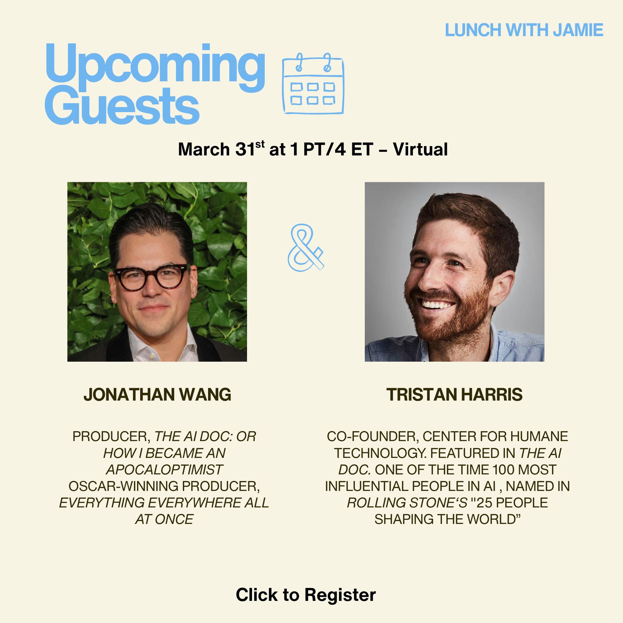 Let me know what you think. Because this conversation is so critical, I have Tristan Harris, founder of the Center for Humane Technology and one of the experts featured in the doc, and producer Jonathan Wang on Lunch With Jamie on Tuesday, 3/31 at 1 PT/4 ET. Register here. Because of how critical this conversation is, we are opening it up to free subscribers as well — but as always, only members have the chance to ask questions and shape the topics we cover.